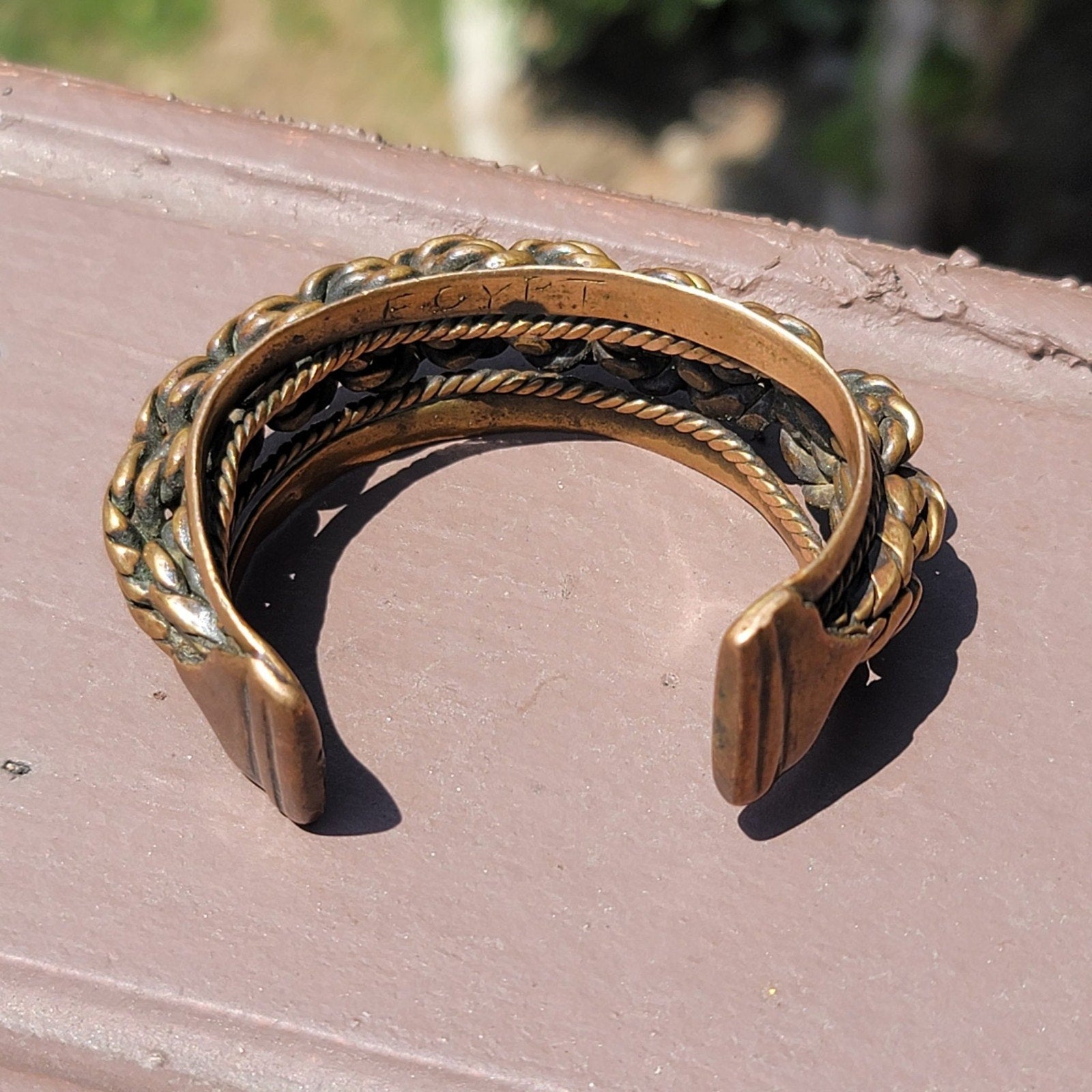 Vtg Egyptian Thick Braided Cuff Brass Bracelet