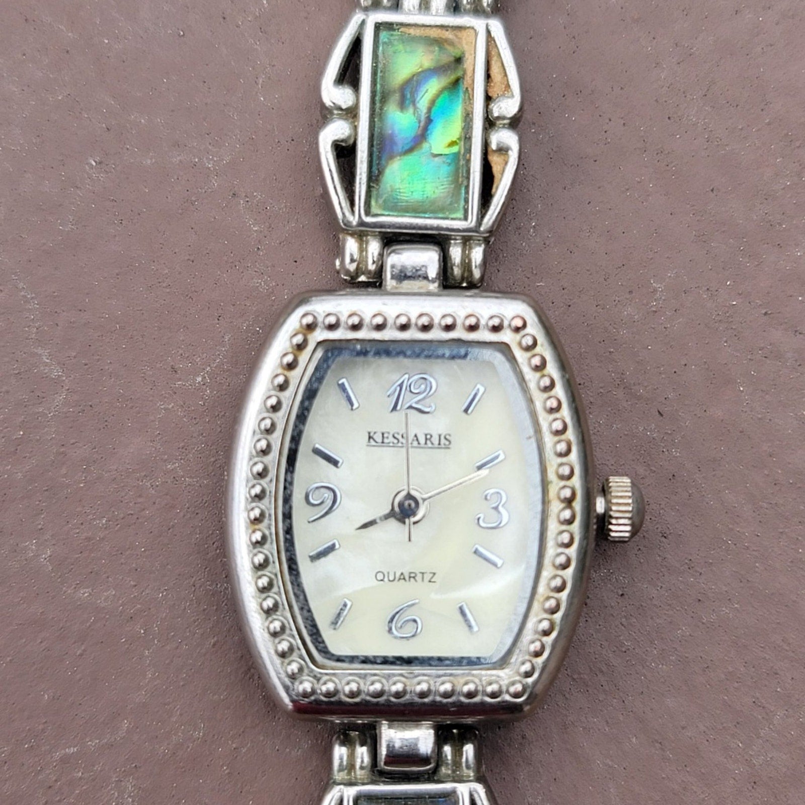 Vtg Silver Tone Kessaris Abalone Gemstone Band Watch