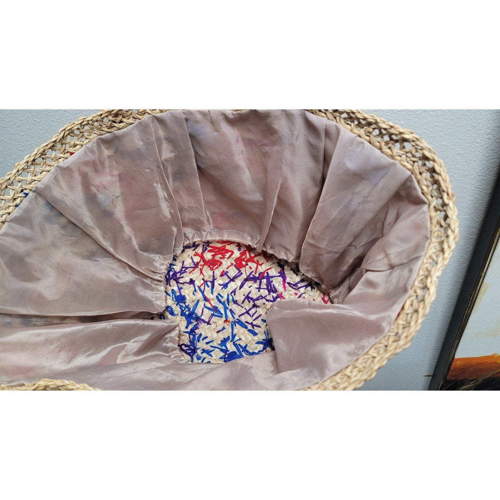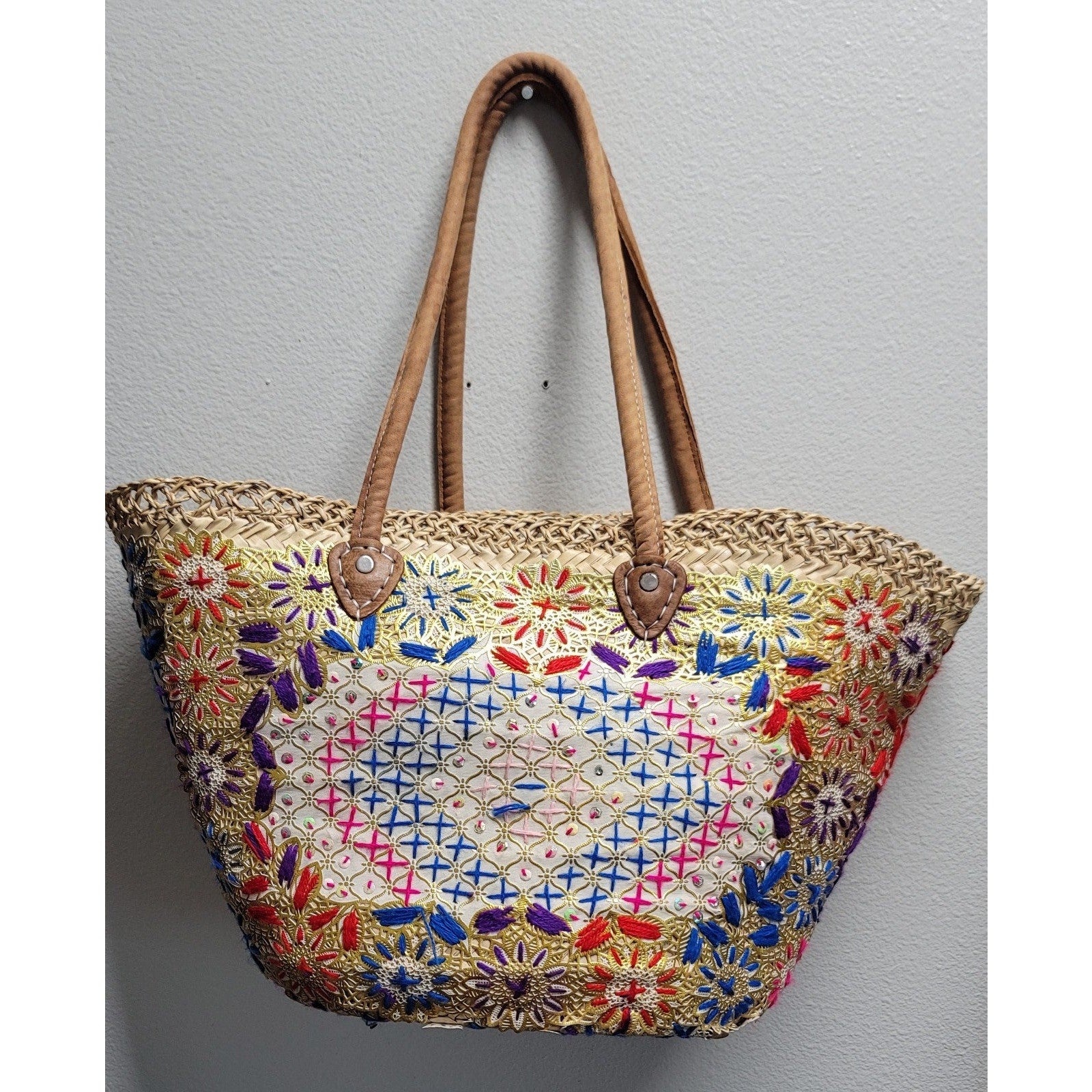 Vtg Straw Hand Woven Large Tote Bag Embroidered